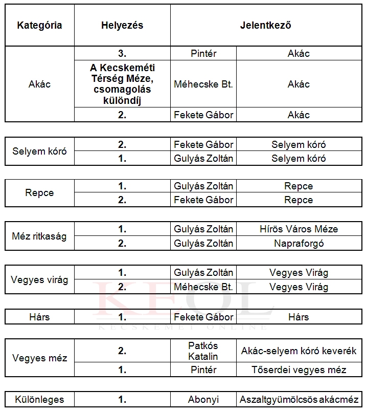 Az Aranyhomok Kistérségfejlesztési Egyesület és az Országos Magyar Méhészeti Egyesület Észak-Bács-Kiskun megyei szervezete által meghirdetett mézversenyen három kategóriában lehetett indulni: fajtaméz, vegyesmézek és mézkülönlegességek.
