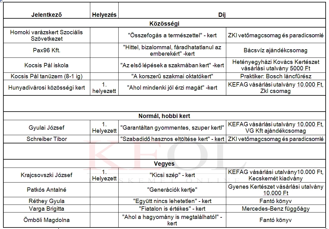 Az Aranyhomok Kistérségfejlesztési Egyesület által meghirdetett „A legszebb konyhakertek" pályázat zsűrijének tagjai voltak: Nagy Ágnes Kecskemét Város Főkertésze, Hamzáné Lakó Judit az Aranyhomok Kistérségfejlesztési Egyesület titkára, Kocsis Pál a Kecskeméti Humán Szakképző Iskola Kocsis Pál Mezőgazdasági és Környezetvédelmi Szakközépiskola és Szakiskolájának volt igazgatója.