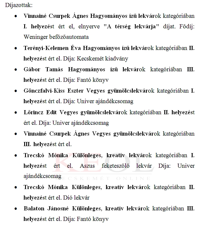 A felhívásra 23 lekvárkészítő jelentkezett 65-féle lekvárral 11 településről. (Kecskemét Kunbaracs Nyárlőrinc Felsőlajos Tiszaug Tiszaalpár Városföld Tiszakécske Kunszállás Lajosmizse Helvécia).