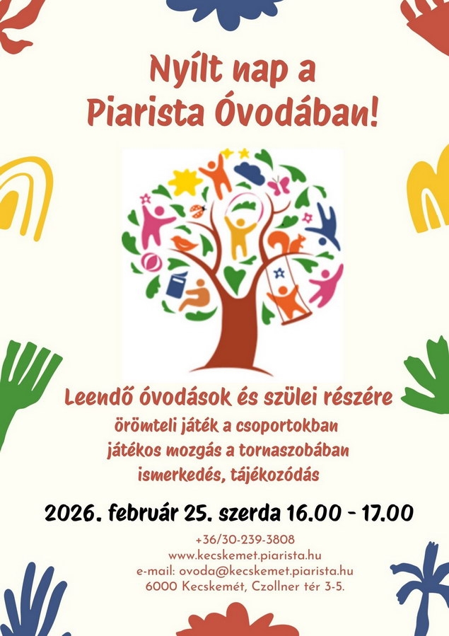 A kecskeméti Piarista Óvoda szeretettel hívja és várja az érdeklődő kisgyermekes családokat második, februári nyílt napjára. A 2026. február 25-én, szerdán 16 órakor kezdődő délutánon a csoportszobákban várják a leendő óvodásokat, ahol bekapcsolódhatnak az óvodások játéktevékenységébe.