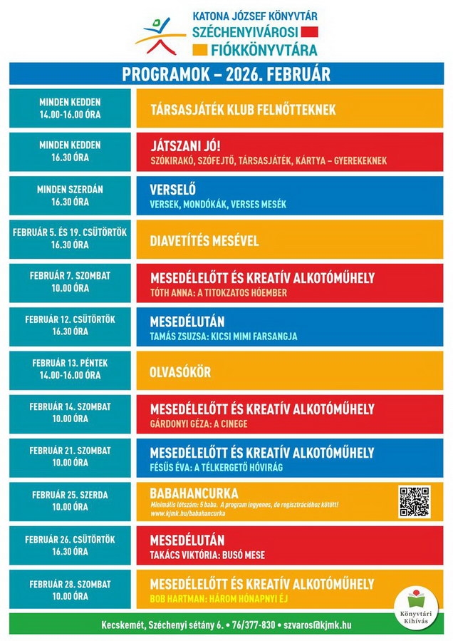 Cikkünk képgalériájában (lent) megtekinthető a Katona József Könyvtár kiemelt programkínálata 2026. február 23. és március 01. között.