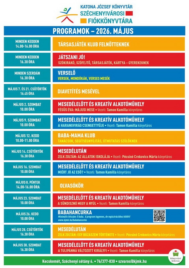 Cikkünk képgalériájában (lent) megtekinthető a Katona József Könyvtár kiemelt programkínálata 2026. április 27. és május 03. között.