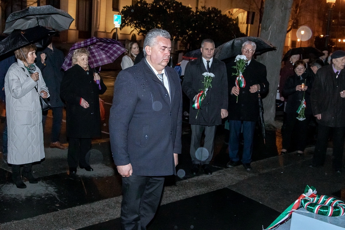 A Kereszténydemokrata Néppárt Kecskemét városi szervezete rendezett ünnepélyes megemlékezést a Kommunizmus Áldozatainak Emléknapja alkalmából, 2024. február 25-én, vasárnap délután 17 órakor Kecskeméten, a Lestár téri kopjafánál. (Fotó: Vincze József)