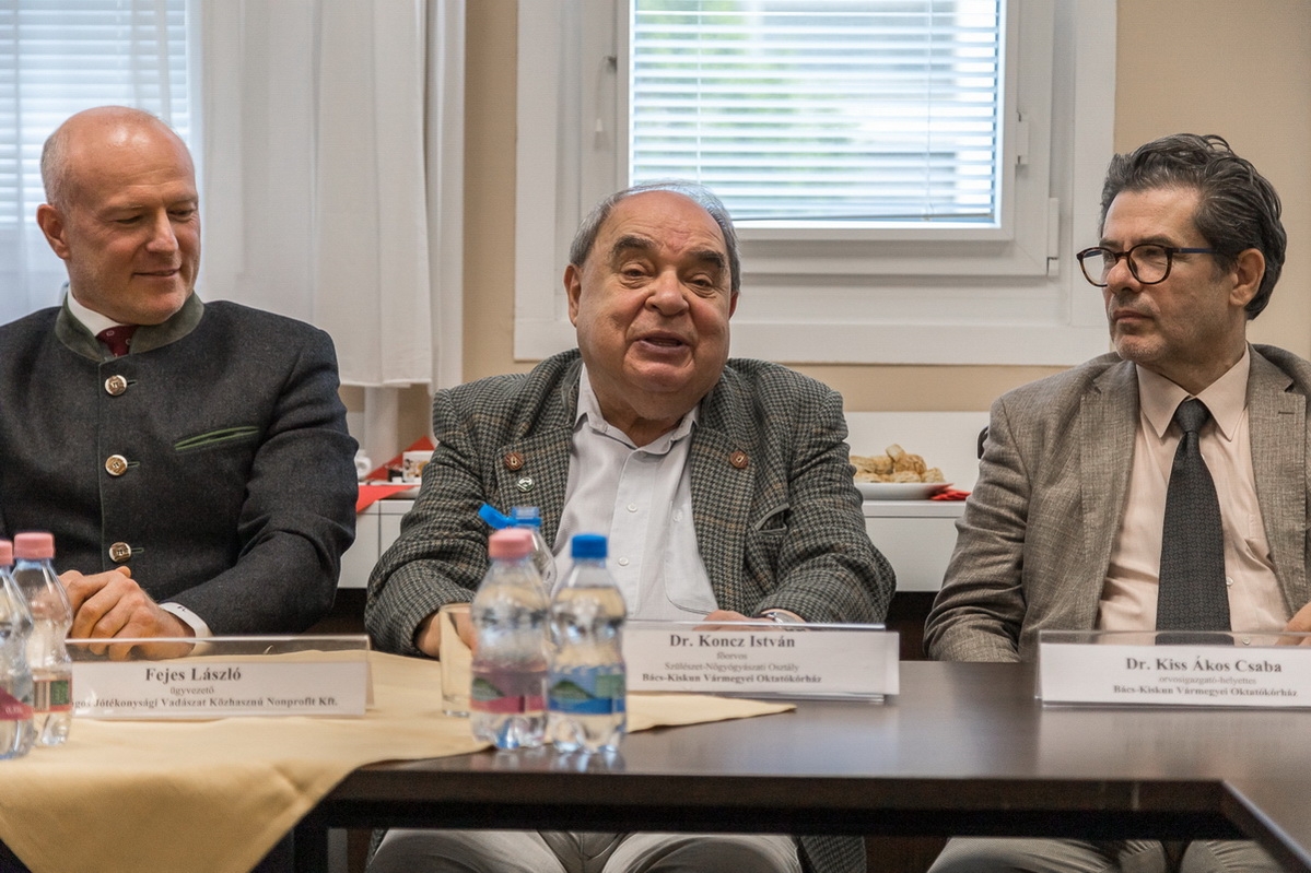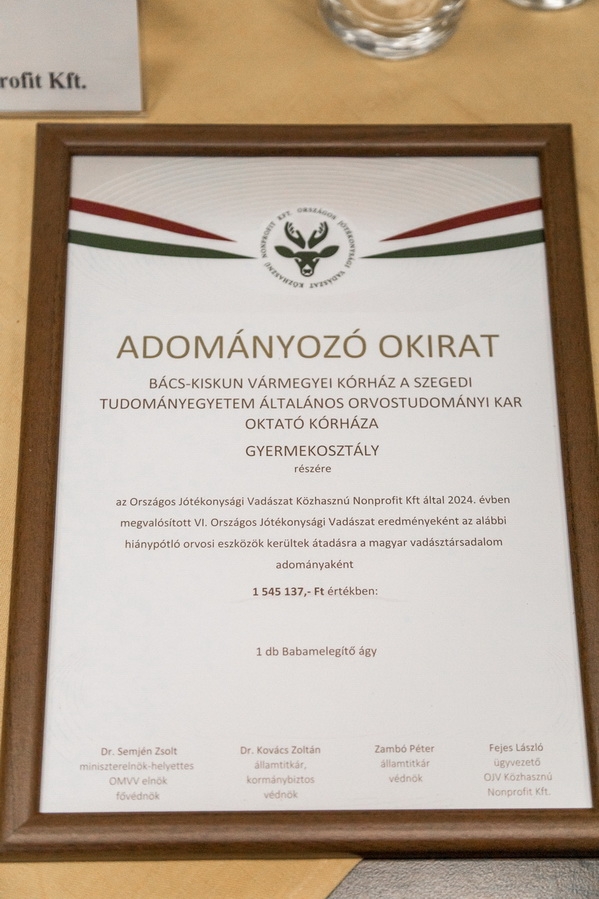 Fejes László, az Országos Jótékonysági Vadászat Közhasznú Nonprofit Kft. ügyvezetője, Királyházi Péter vármegyei stratégiai partner, tájegységi fővadász, dr. Mák Kornél, a Bács-Kiskun Vármegyei Közgyűlés alelnöke, Dr. Lénárt Endre, a Bács-Kiskun Vármegyei Oktatókórház orvosigazgatója, Dr. Kiss Ákos Csaba, a Bács-Kiskun Vármegyei Oktatókórház orvosigazgató-helyettese, Ralovich Csilla, a Bács-Kiskun Vármegyei Oktatókórház ápolási igazgatója, Havasiné Szakonyi Katalin, a Bács-Kiskun Vármegyei Oktatókórház kórház gazdasági igazgatója, Dr. med. habil. Tálosi Gyula PhD, a Bács-Kiskun Vármegyei Oktatókórház Csecsemő- és Gyermekgyógyászati Osztály osztályvezető főorvosa, Dr. Kelemen Edit, a Bács-Kiskun Vármegyei Oktatókórház Csecsemő-és Gyermekgyógyászati Osztály Újszülött Részleg, PIC Részleg részlegvezető főorvosa és Dr. Koncz István, a Bács-Kiskun Vármegyei Oktatókórház Szülészet-Nőgyógyászati Osztály főorvosa