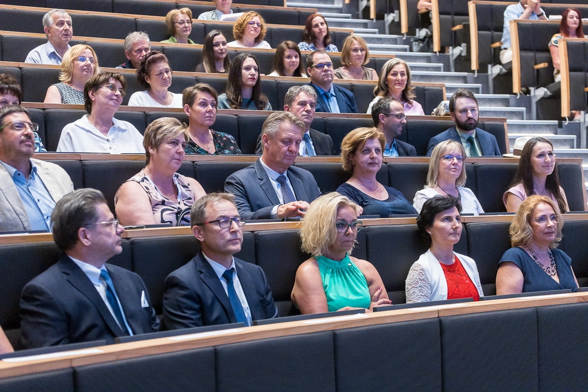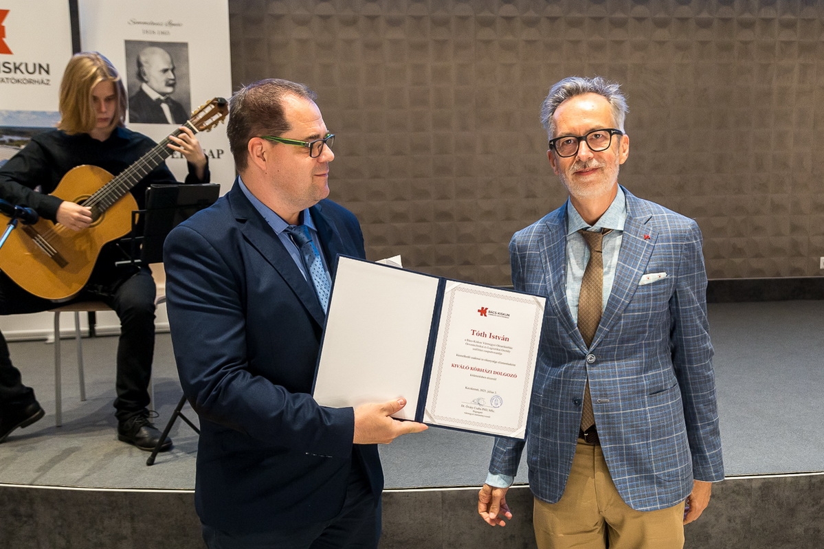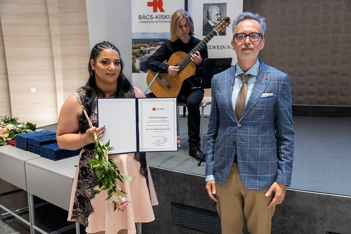 A Magyar Egészségügy Napja alkalmából elismeréseket és kinevezéseket adott át munkatársainak a Bács-Kiskun Vármegyei Oktatókórház vezetősége 2025. július 3-án, csütörtökön a kecskeméti Neumann János Egyetem CAMPUS Oktatási Épületében tartott Semmelweis-napi ünnepségen. (Fotók: Vincze József)