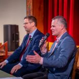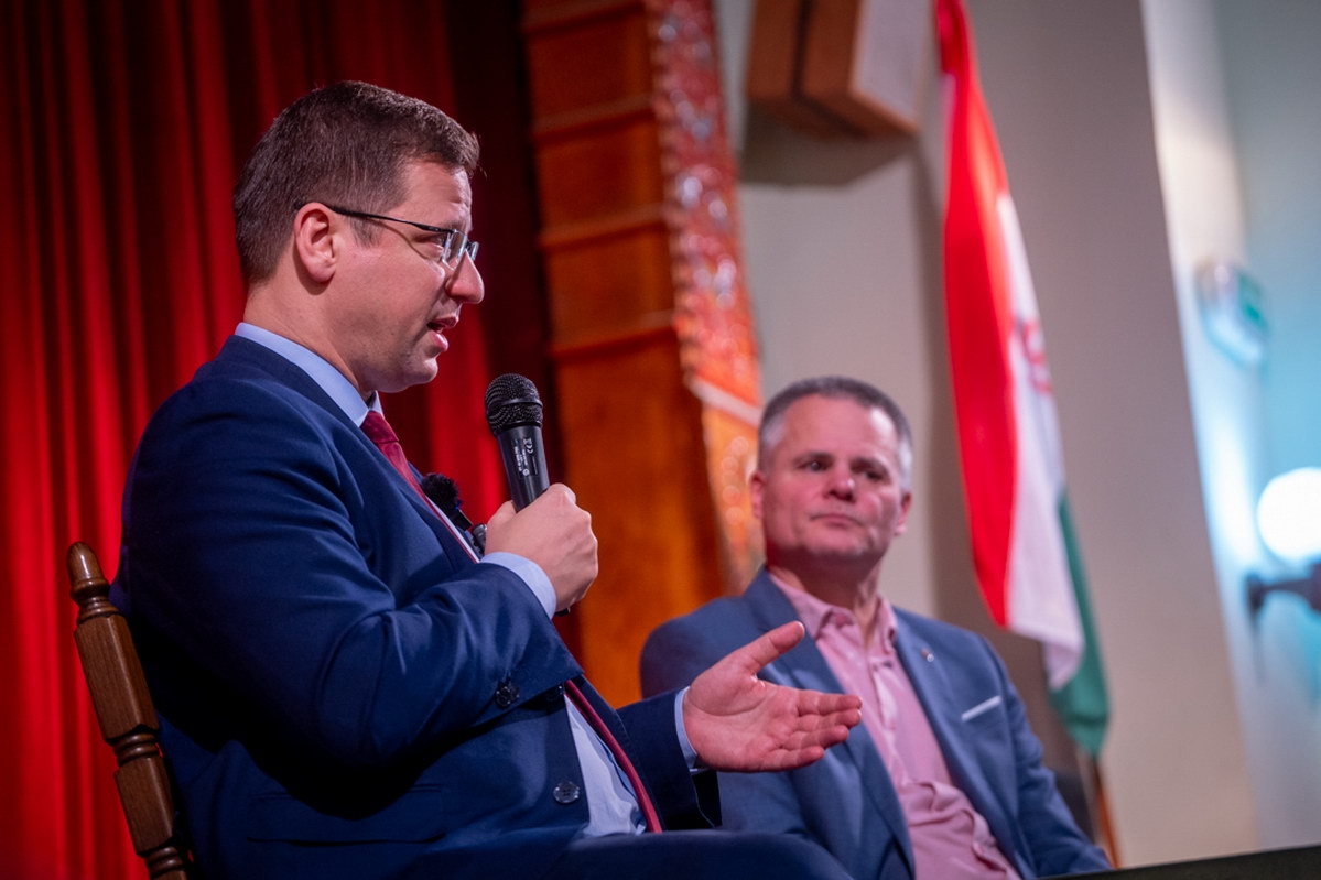 Gulyás Gergely, a Miniszterelnökséget vezető miniszter volt dr. Salacz László (Fidesz-KDNP) országgyűlési képviselő vendége Kecskeméten, 2026. február 27-én, pénteken délután a Kocsis Pál Mezőgazdasági Szakképző Iskola konferenciatermében. (Fotó: Gulyás Gergely és dr. Salacz László a sajtótájékoztatón - Szamler Roland - Szamler Photography)