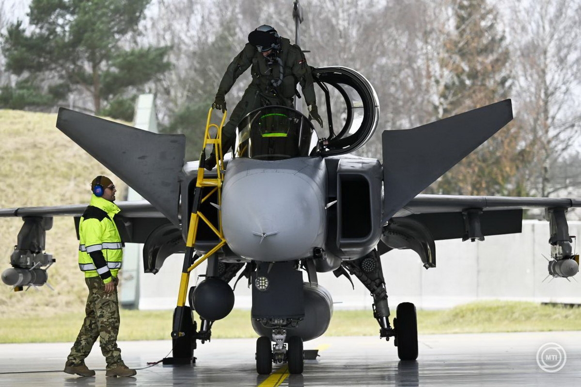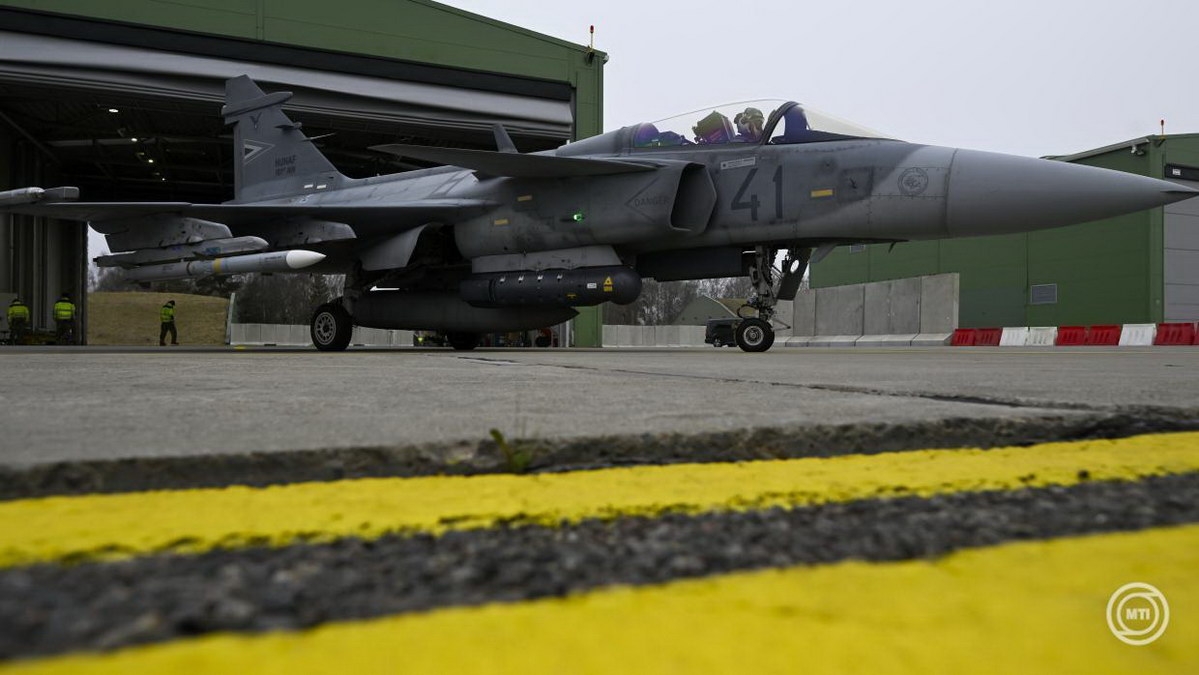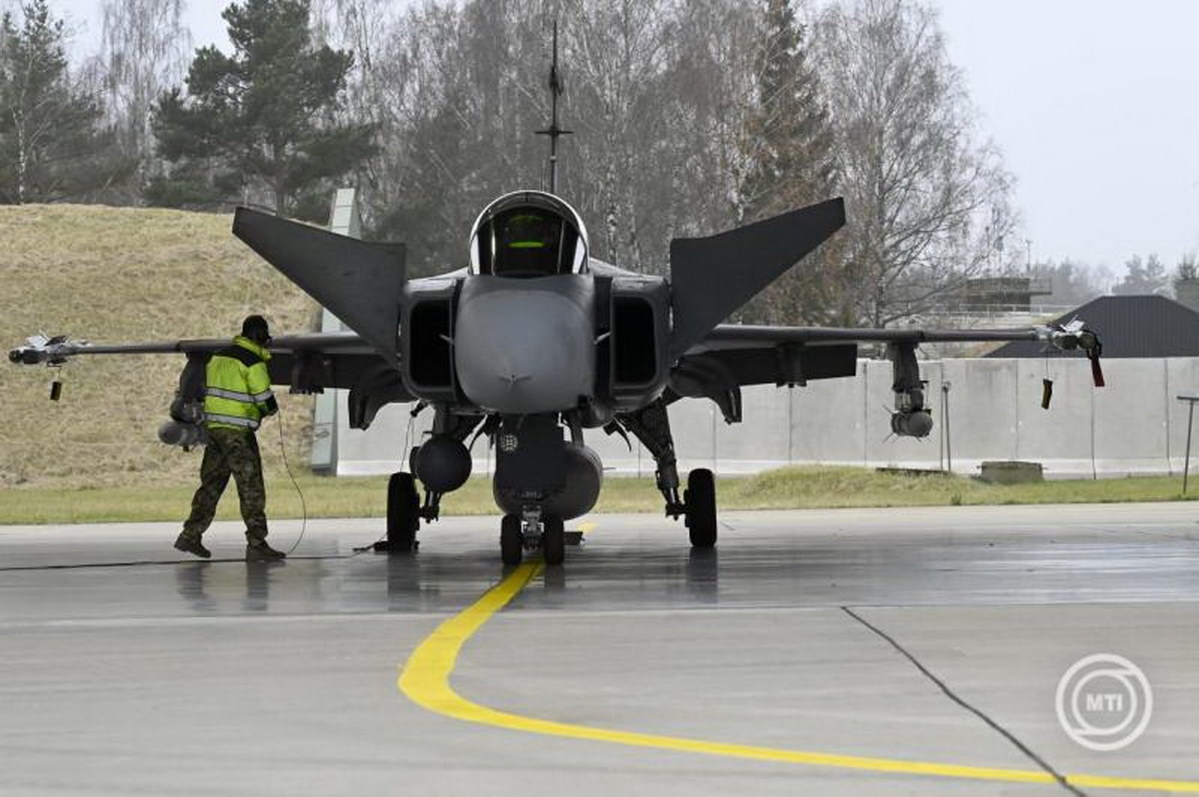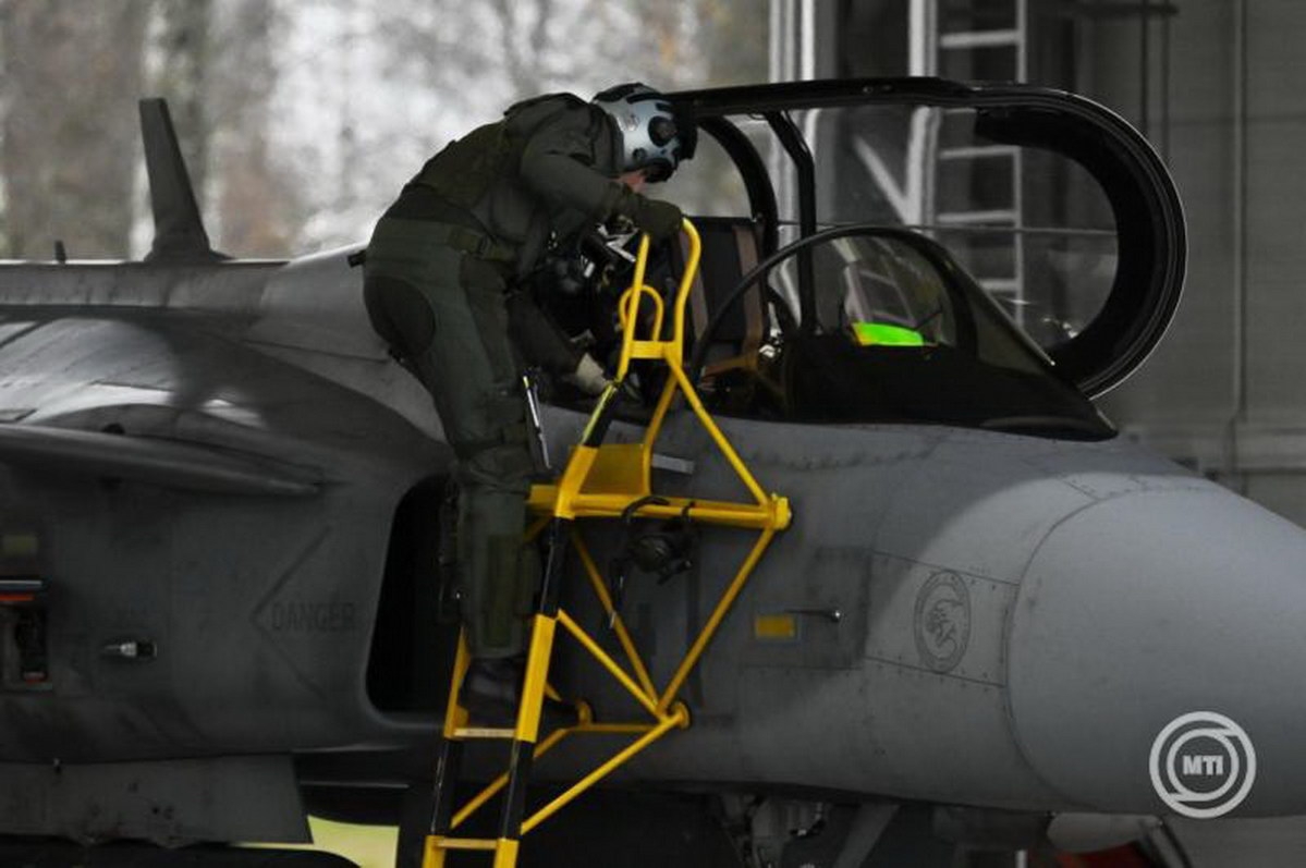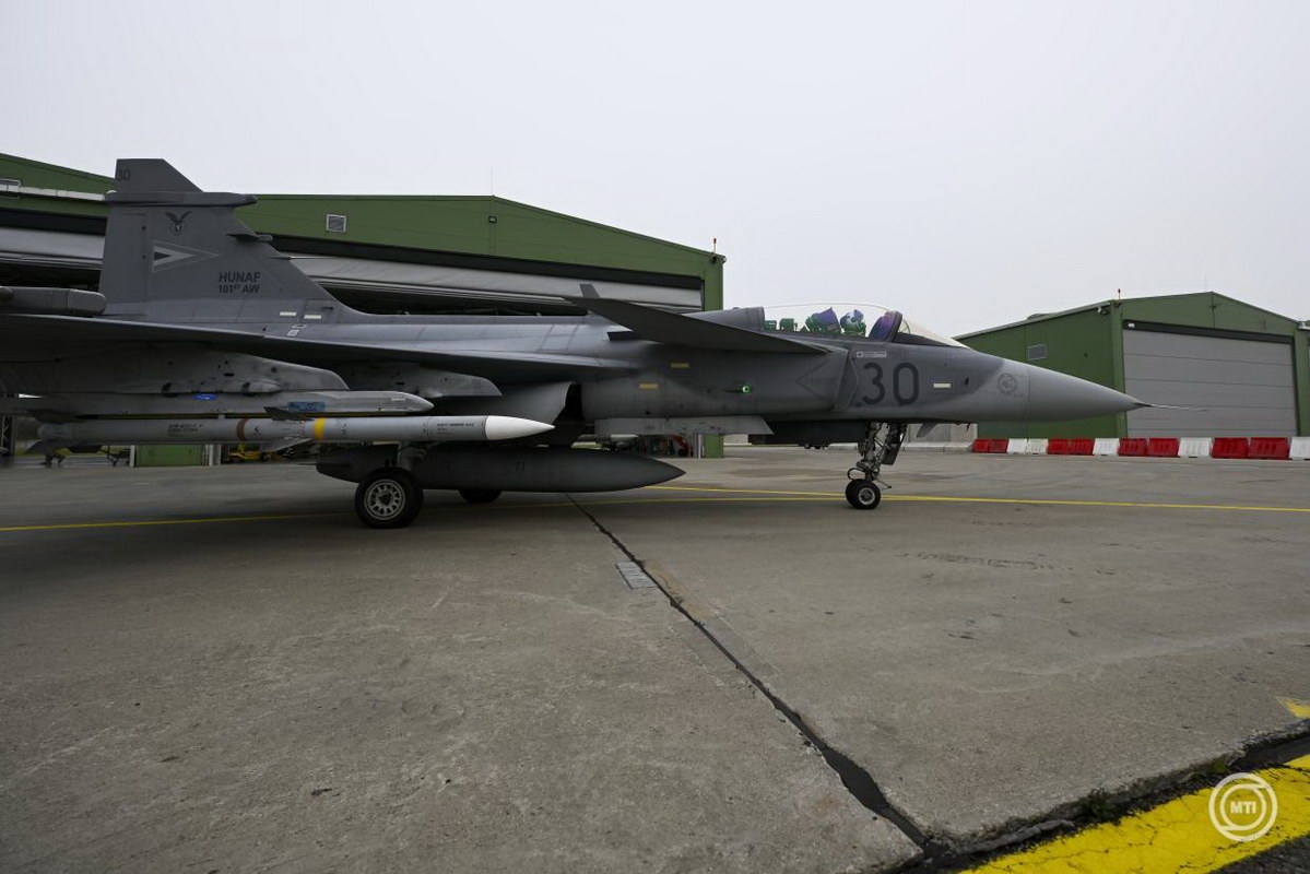 Az elmúlt három és fél hónapban 20 éles, katonai kóddal ALFA riasztást kaptak a magyar légierő JAS-39C Gripen vadászgépei, amelyek a NATO Baltic Air Policing (BAP) missziójában végzik a Balti államok légtérrendészetét - közölte a Magyar Honvédség Fegyveres Légvédelmi Készenléti Alegység vezetője, a litvániai Siauliai melletti légibázison megtartott szerdai sajtóbejáráson. (Fotó: MTI/Hegedüs Róbert)