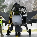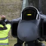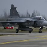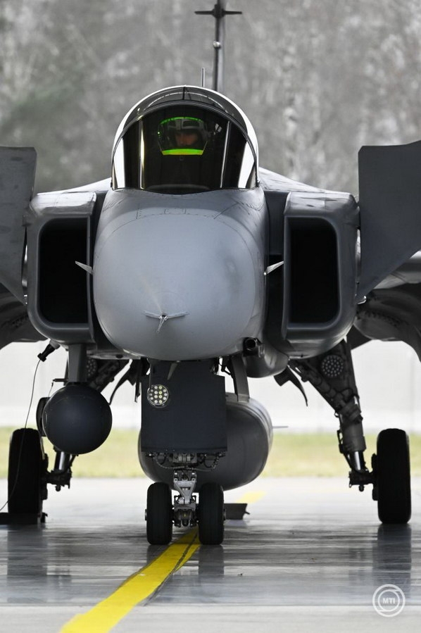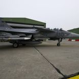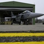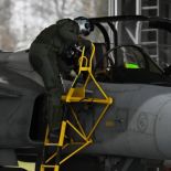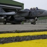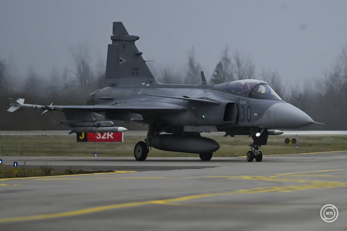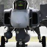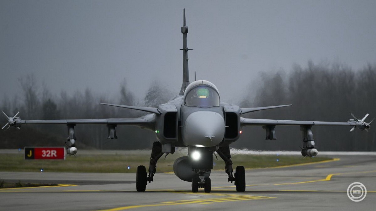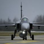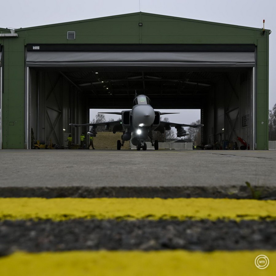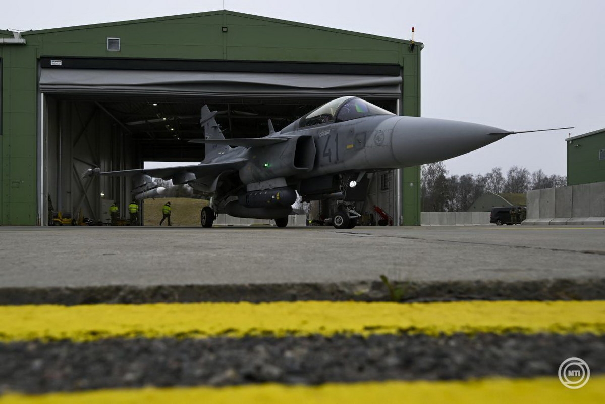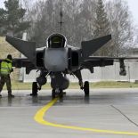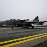 Az elmúlt három és fél hónapban 20 éles, katonai kóddal ALFA riasztást kaptak a magyar légierő JAS-39C Gripen vadászgépei, amelyek a NATO Baltic Air Policing (BAP) missziójában végzik a Balti államok légtérrendészetét - közölte a Magyar Honvédség Fegyveres Légvédelmi Készenléti Alegység vezetője, a litvániai Siauliai melletti légibázison megtartott szerdai sajtóbejáráson. (Fotó: MTI/Hegedüs Róbert)