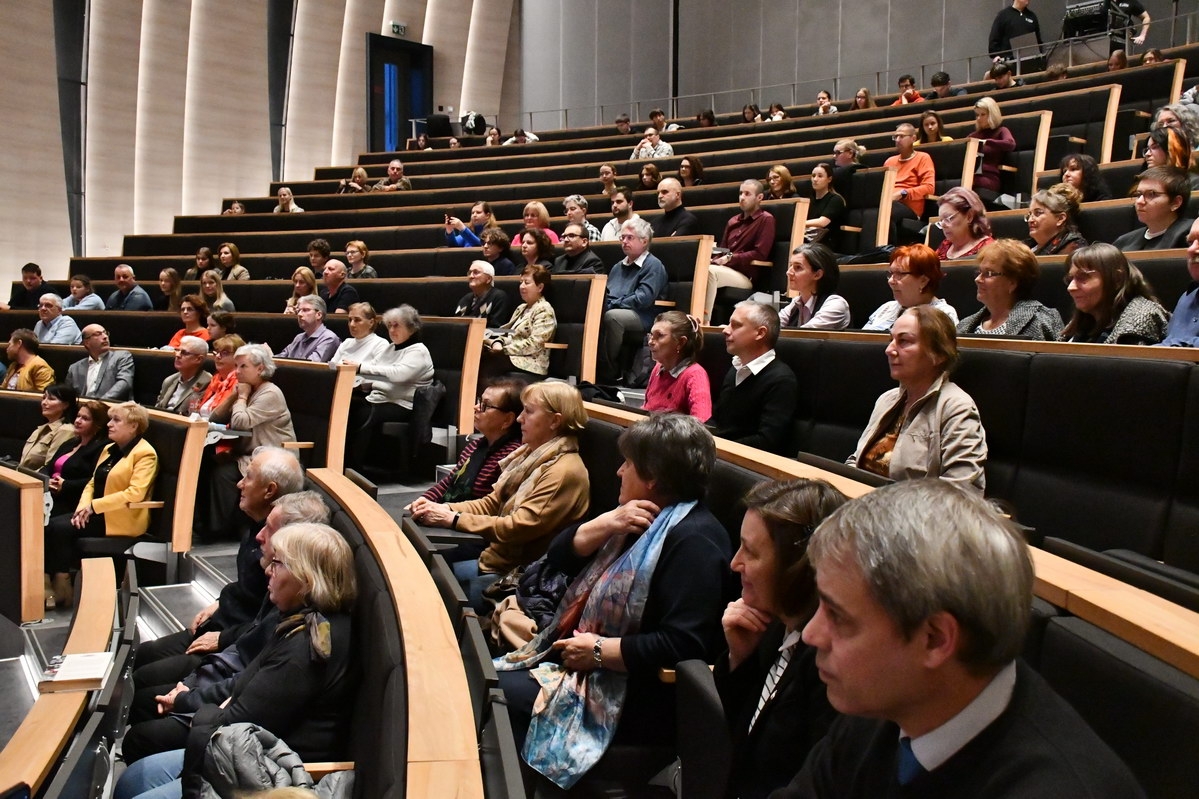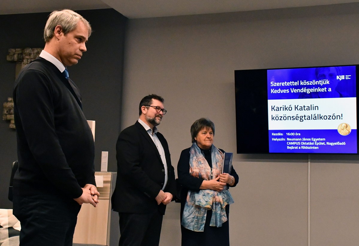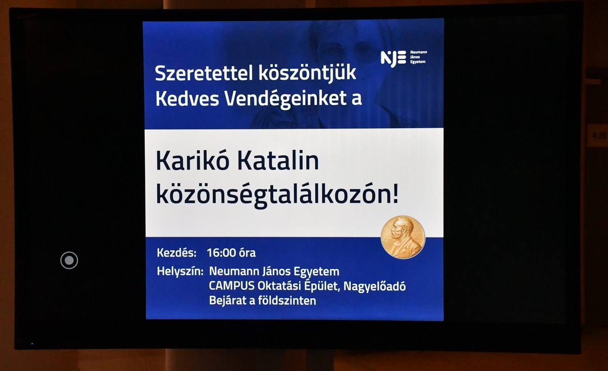 A Nobel-díjas Karikó Katalin magyar biokémikussal találkozhattak az érdeklődők 2025. november 16-án, vasárnap Kecskeméten, a Neumann János Egyetem Campusán. A világhírű kutatót hatalmas szeretettel, figyelemmel fogadta és hosszú tapssal köszöntötte a kecskeméti közönség az egyetem nagyelőadójában.