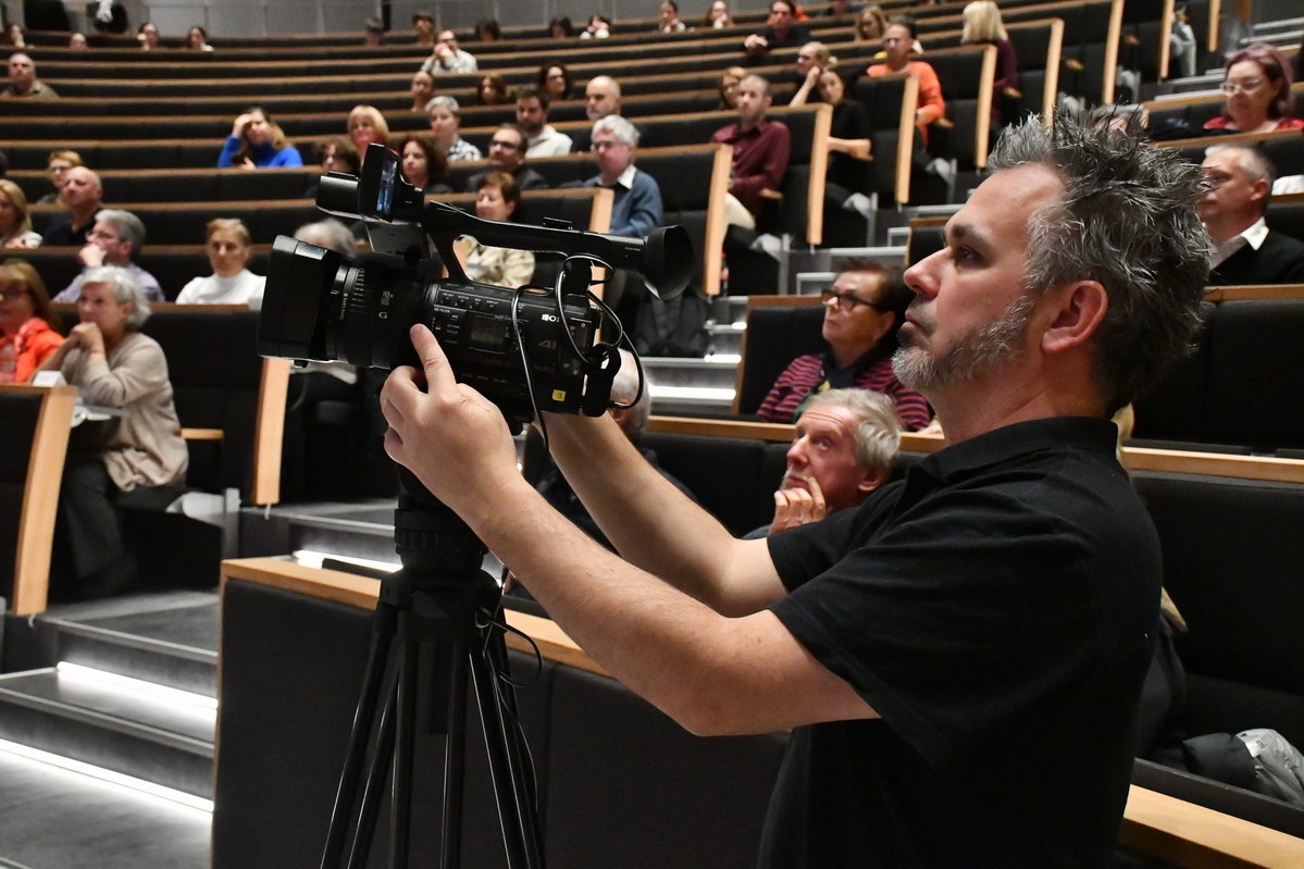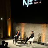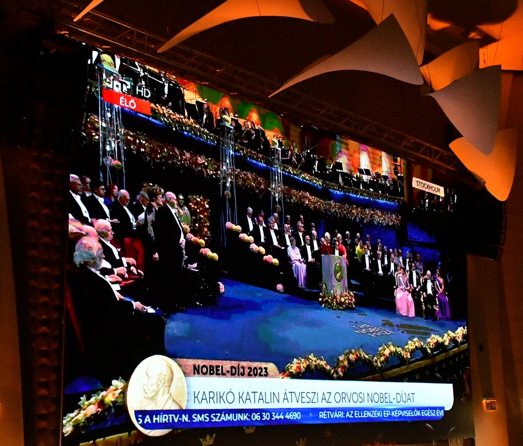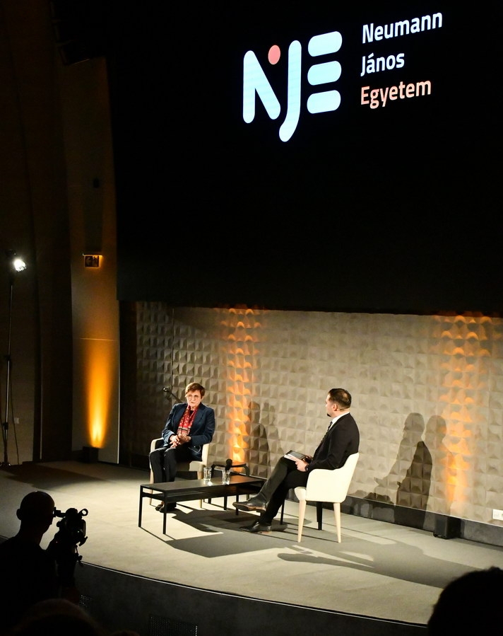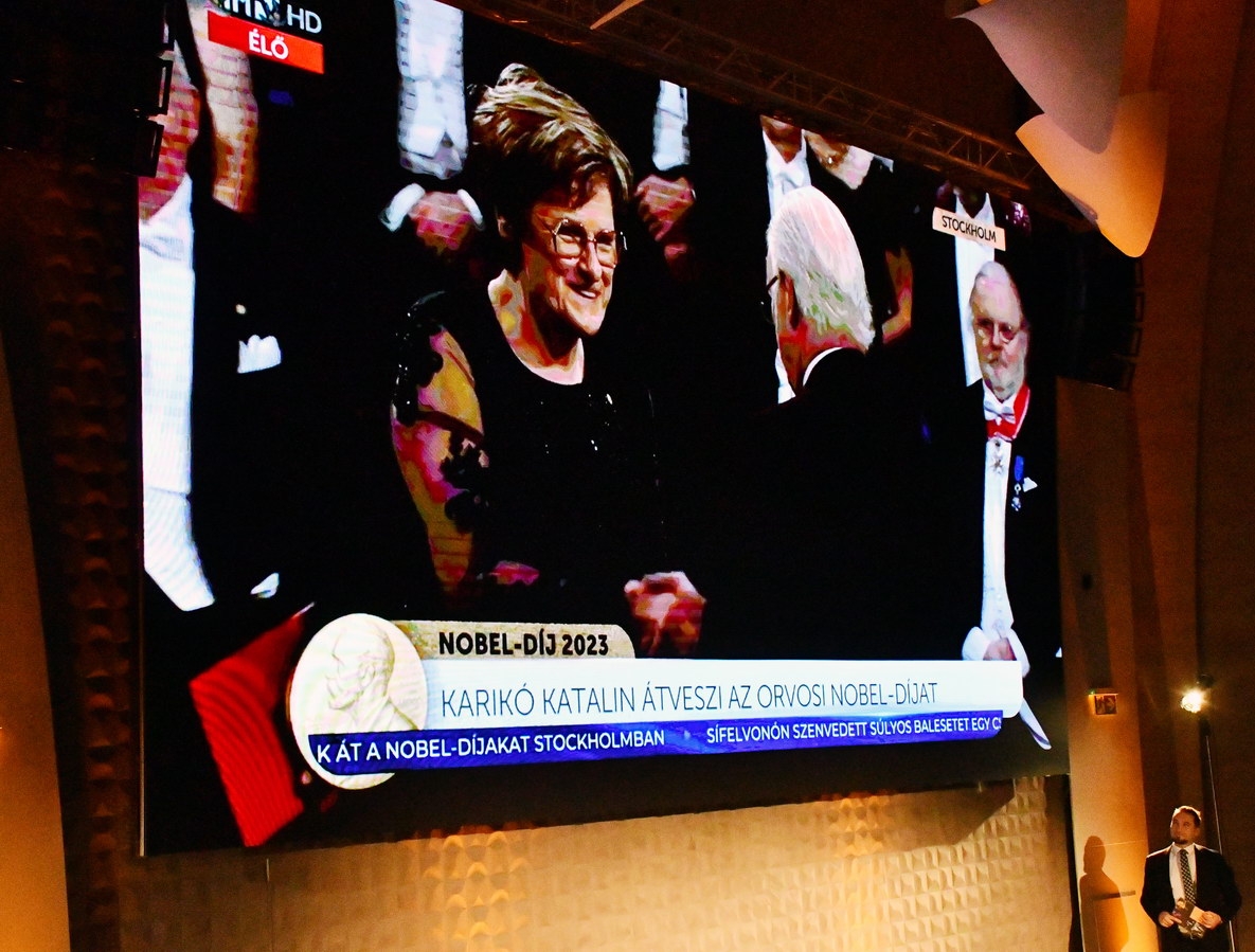 Karikó Katalinnal a nagyelőadóban Árvay Zoltán, a Neumann János Egyetemért Alapítvány kommunikációs vezetője beszélgetett. Ebben a Nobel-díjas magyar biokémikus életútjának meghatározó állomásait elevenítették fel. Elmondta többek között, hogy a kisújszállási szülői házban 10 éves koráig egy szobában lakott a család: a szülei, a nővére és ő. Az iskolában - hiszen Karikó Katalin is „Ratkó gyerek", ötvenen voltak az osztályban.
