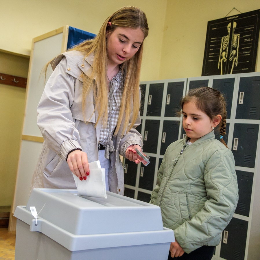 Magas részvételi arány mellett zajlik a 2026. április 12-i parlamenti választás Magyarországon, ami ismét előtérbe helyezi azt a régóta vitatott kérdést, vajon kinek kedvez a választói aktivitás növekedése. Az elmúlt másfél évtized tapasztalatai alapján azonban úgy tűnik, hogy egy korábban széles körben elfogadott állítás mára megdőlt. (Vincze József fotóin Szemereyné Dr. Pataki Klaudia és családja szavaz a Bányai Júlia Gimnáziumban vasárnap délelőtt.)
