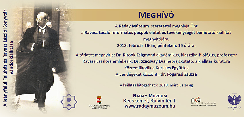 Ravasz László református püspök életét és tevékenységét bemutató kiállítás nyílik a Ráday Múzeumban (Kecskemét, Kálvin tér 1.) 2018. február 16-án, pénteken, 15 órakor.