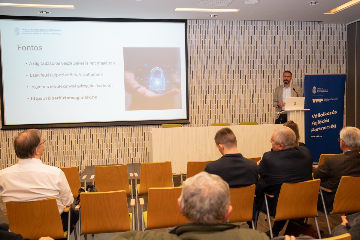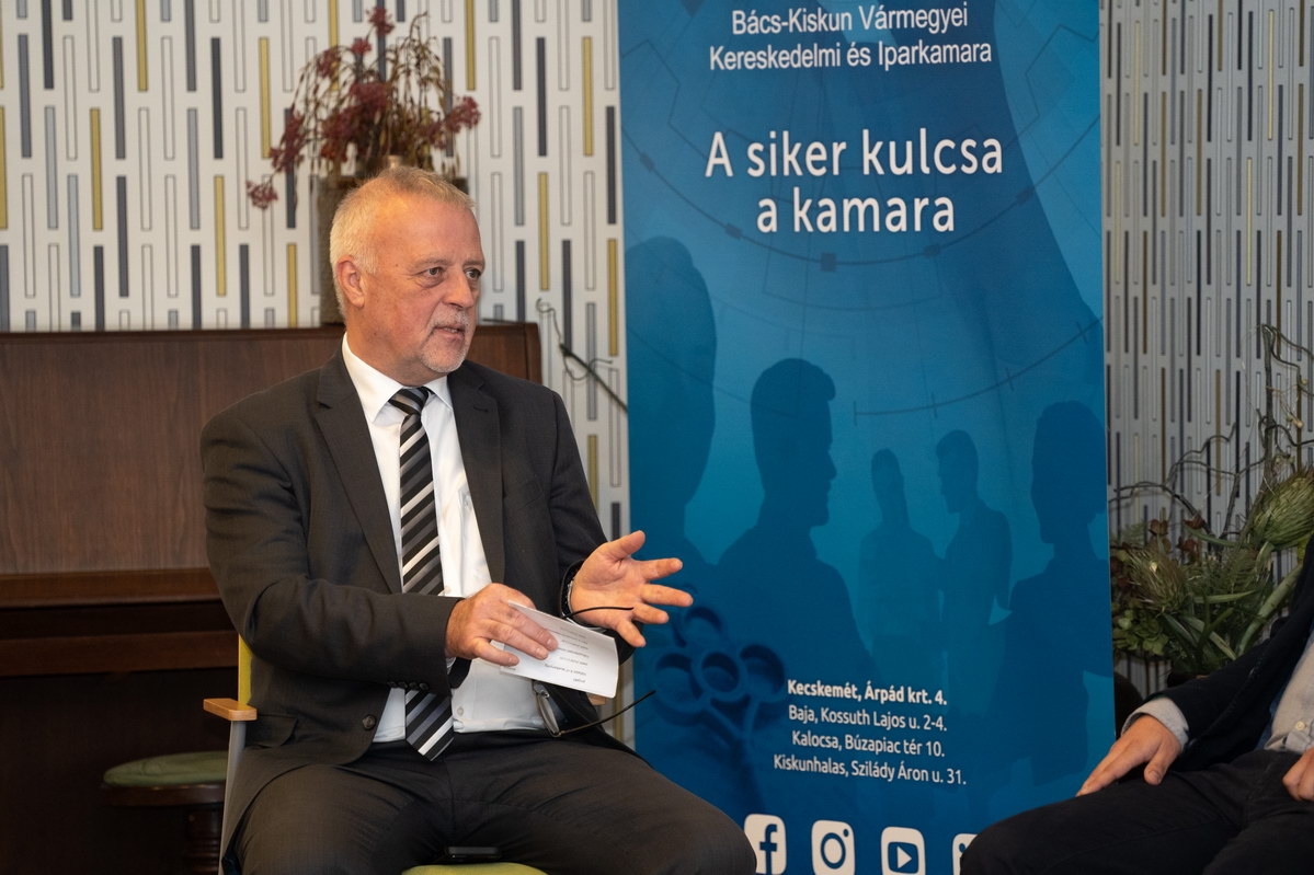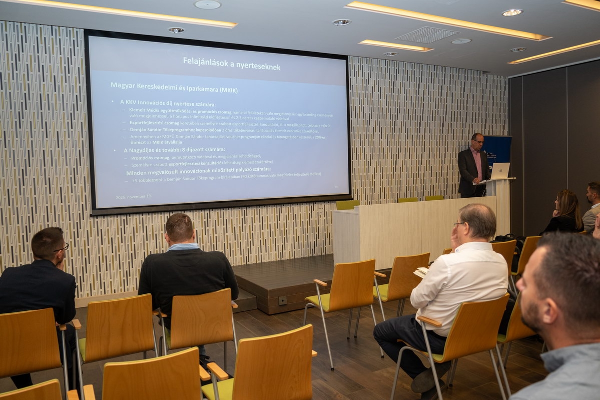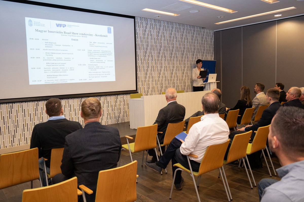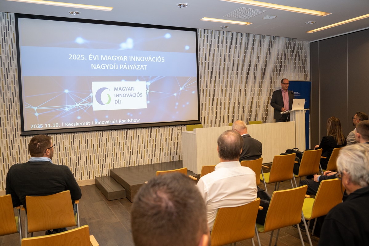 2025. november 19-én Kecskeméten rendezte meg a Magyar Kereskedelmi és Iparkamara (MKIK) az országos Innovációs Roadshow egyik állomását, a Bács-Kiskun Vármegyei Kereskedelmi és Iparkamara székházában. Az esemény célja a térség vállalkozásainak támogatása a legfrissebb technológiai trendek, pályázati lehetőségek és bevált innovációs gyakorlatok megismertetésével. A programot a Kulturális és Innovációs Minisztérium (KIM) és több háttérintézmény együttműködésével szervezték. (Fotó: Szakács-Kovács Réka Éva)
