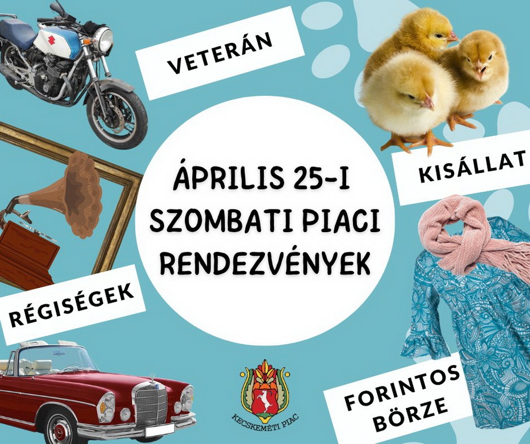 2026. április 25-én, szombaton többféle program várja az érdeklődőket Kecskeméten. A Szent László körúti vásártéren a hagyományos kisállatvásár mellett veterán autó- és motoralkatrész börzét, valamint régiségpiacot is rendeznek.