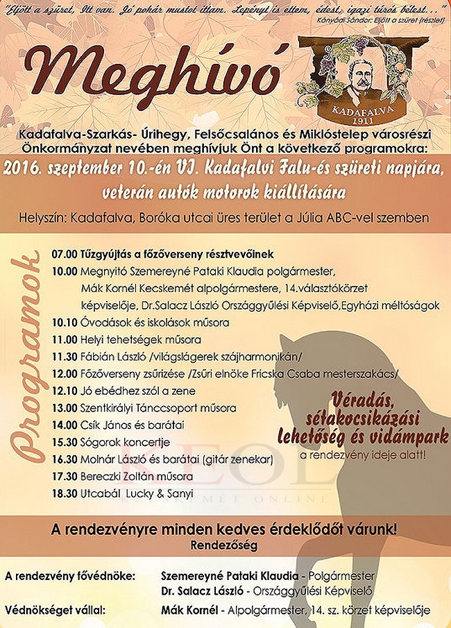 Szeptember 10-én, szombaton tartják a Kadafalvi Falu- és Szüreti Napot: a megnyitó 10 órakor lesz. (Fotó: 2015-ös kadafalvi falunap - Lucza Bernadett)