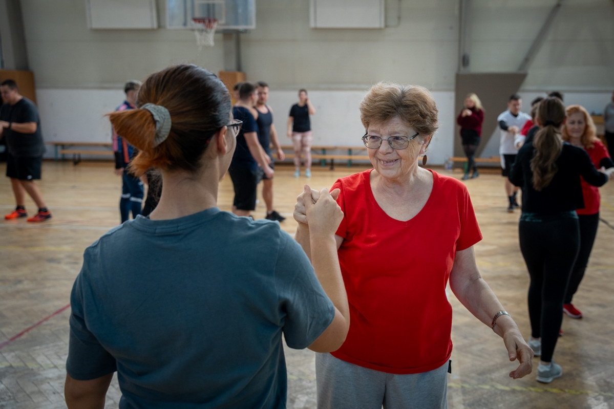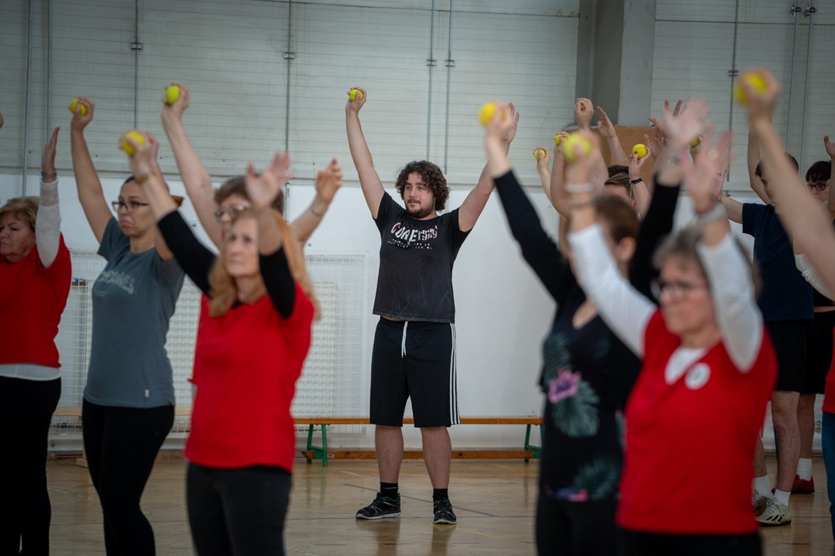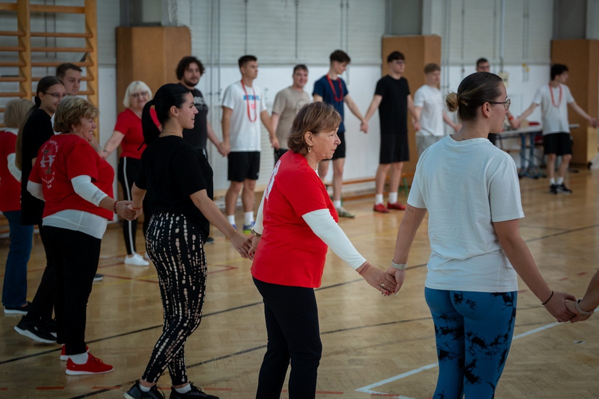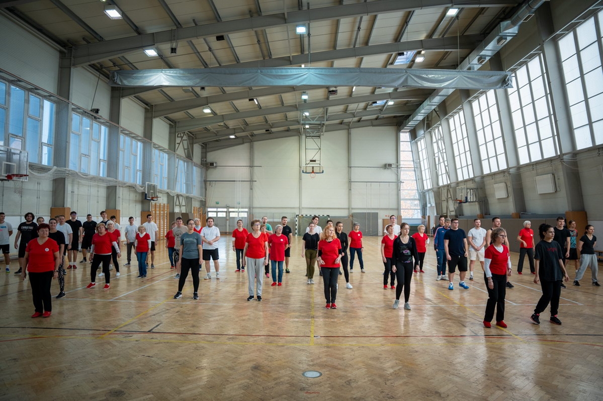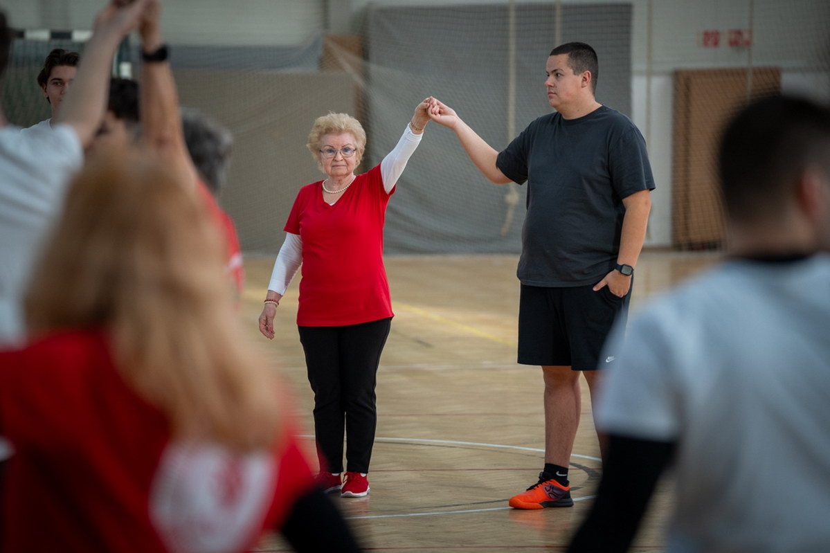 Rendhagyó bemelegítéssel kezdődött 2025. november 10-én, hétfőn reggel 8 órakor a testnevelésóra a Neumann János Egyetem GAMF Karának Törös Olga Sportcsarnokában. Az eseményen két generáció találkozott: fiatal egyetemisták és idősebb szeniorok vettek részt közösen az örömtáncban, amely a mozgás és a párbeszéd különleges formájaként szolgált. (Fotó: Szamler Roland - Szamler Photography)