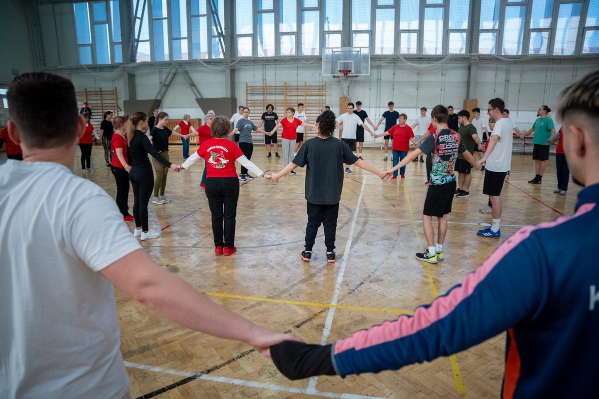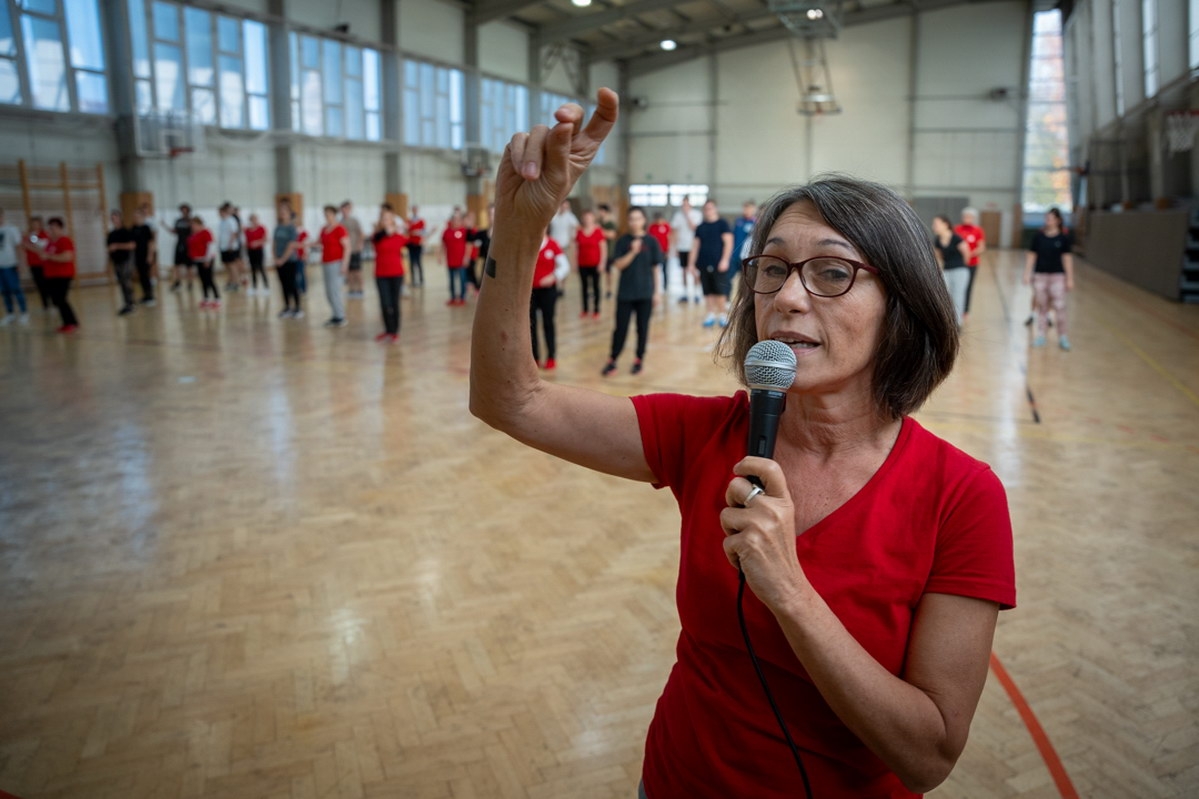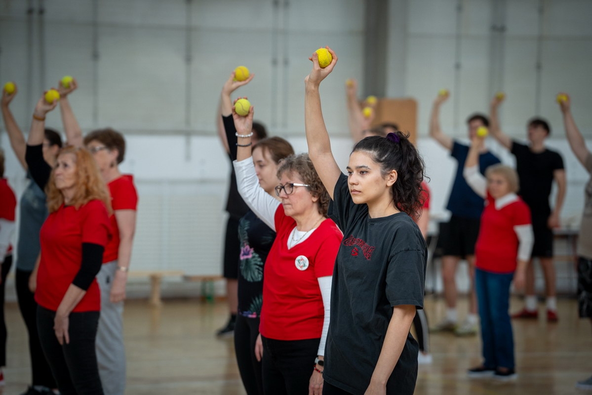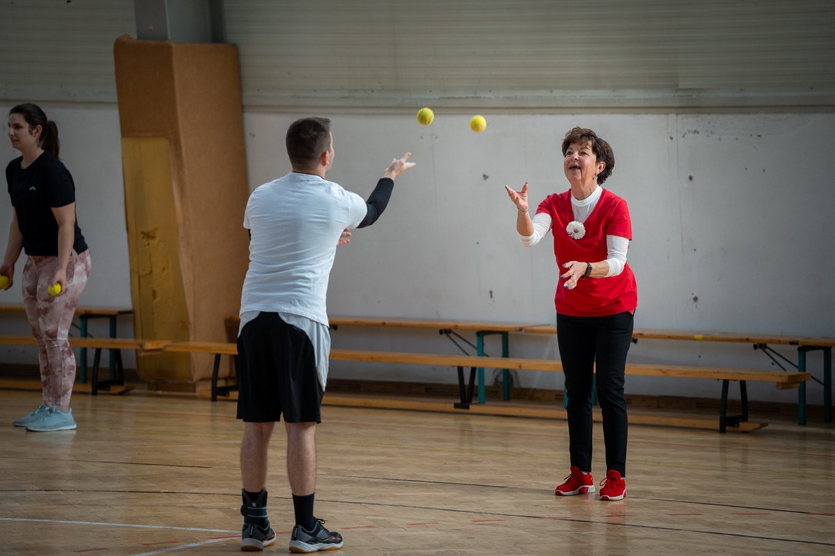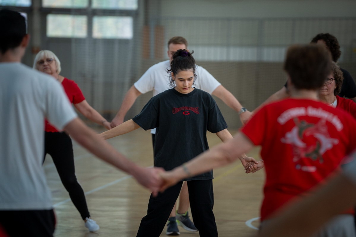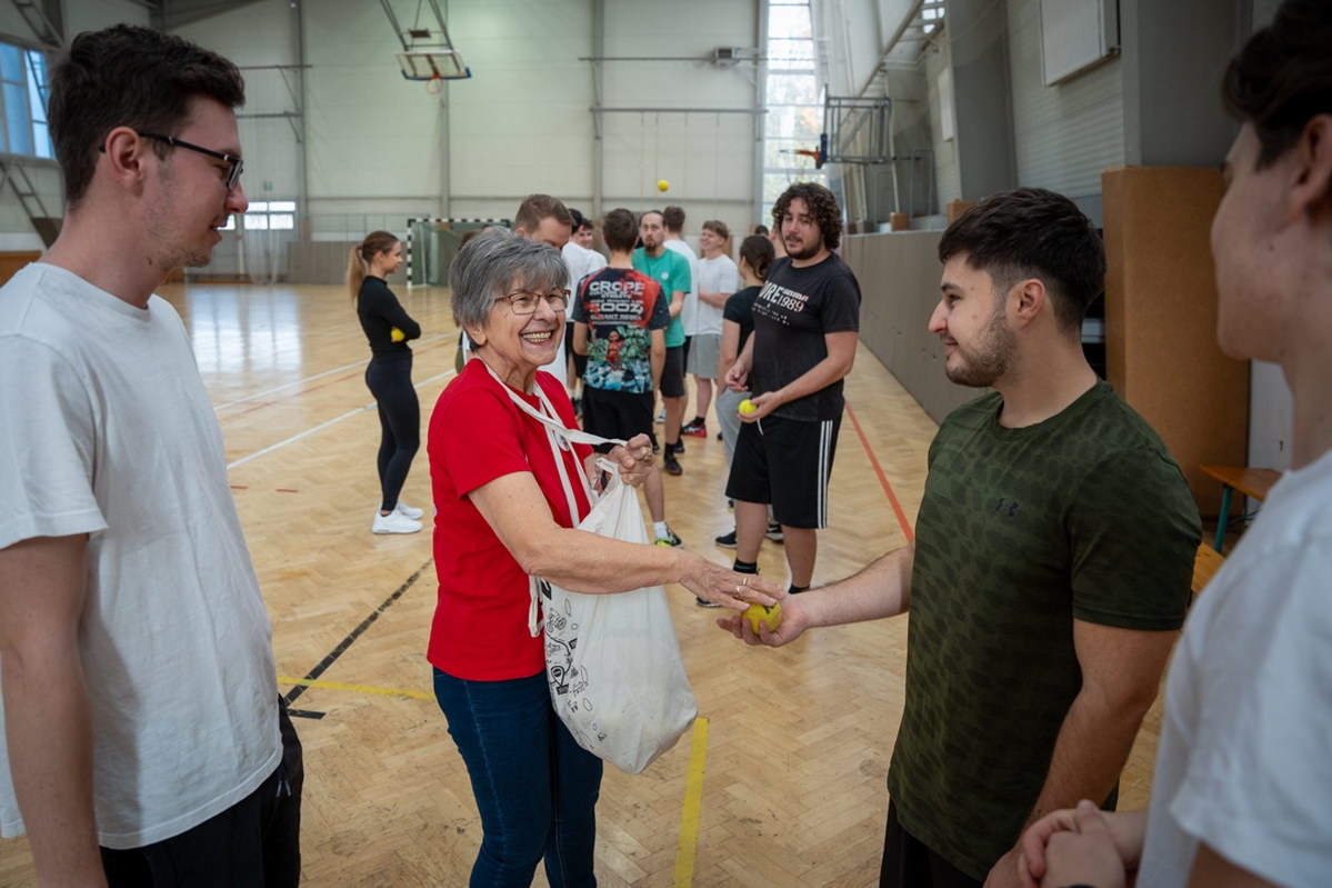 Rendhagyó bemelegítéssel kezdődött 2025. november 10-én, hétfőn reggel 8 órakor a testnevelésóra a Neumann János Egyetem GAMF Karának Törös Olga Sportcsarnokában. Az eseményen két generáció találkozott: fiatal egyetemisták és idősebb szeniorok vettek részt közösen az örömtáncban, amely a mozgás és a párbeszéd különleges formájaként szolgált. (Fotó: Szamler Roland - Szamler Photography)