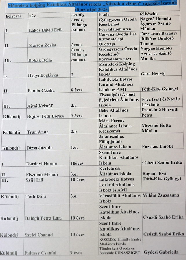 A Ménteleki Kolping Katolikus Általános Iskola immár tizenhetedik éve szervezi meg hagyományos kiállítását, amelyhez hét éve csatlakozott a Kiskun Alapfokú Művészeti Iskola is. A közös pályázati munka minden tanévben egy új témát jár körül; idén a vízi élővilág került a figyelem középpontjába „Állatok a vízben" címmel.