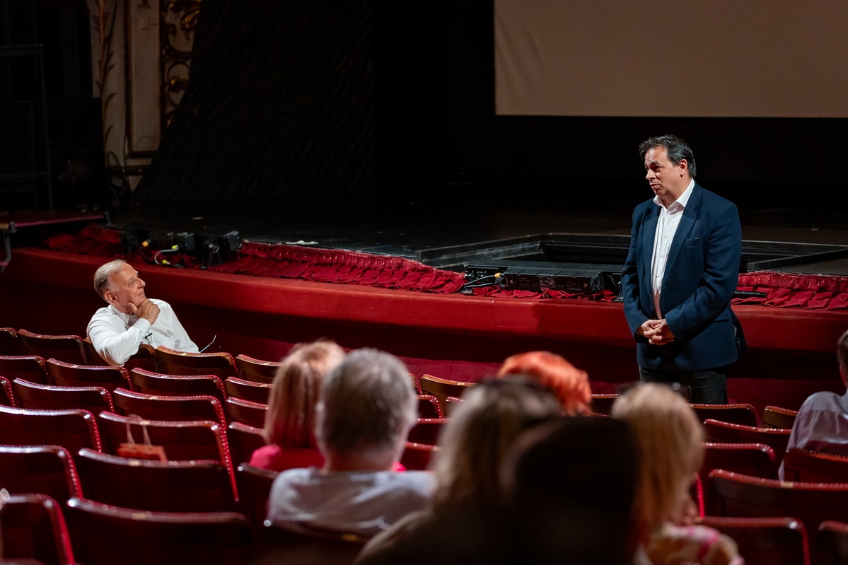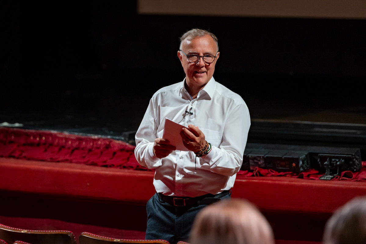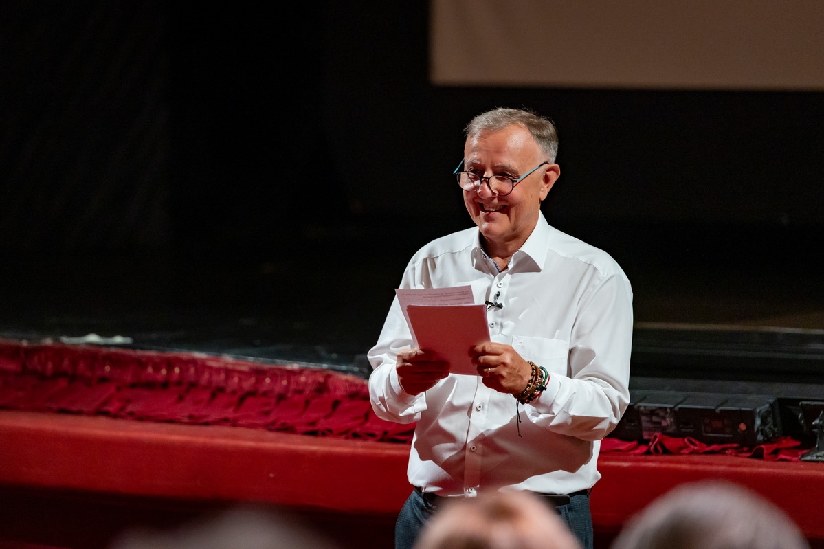 "Egy színházi évad lezárása mindig különleges pillanat. Visszanézünk, számot vetünk. Büszkén és hálával mondhatom: a Kecskeméti Nemzeti Színház mögött ismét egy kiemelkedő évad áll. Tizenhárom bemutatót tartottunk - tizenhárom lehetőséget arra, hogy megérintsük a közönséget, gondolatot ébresszünk vagy éppen felszabadult nevetést halljunk" - kezdte beszédét Cseke Péter direktor.