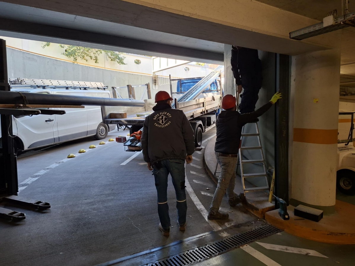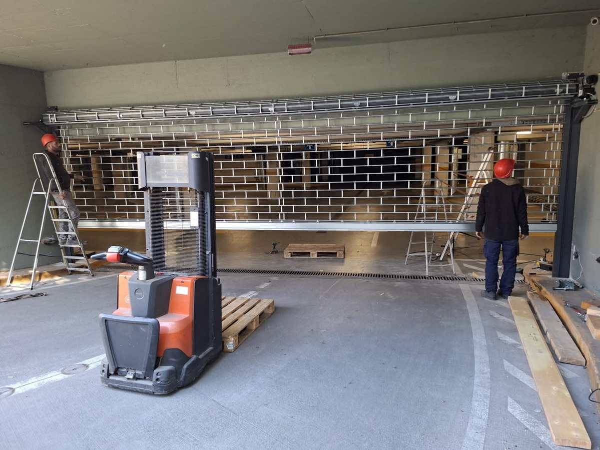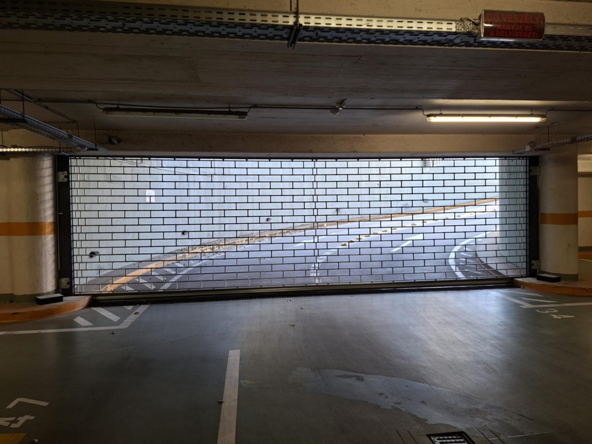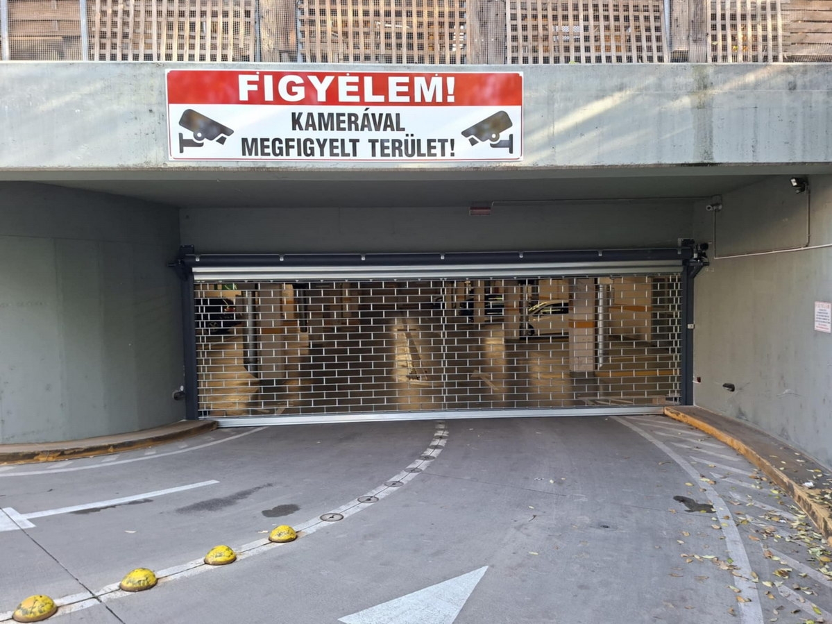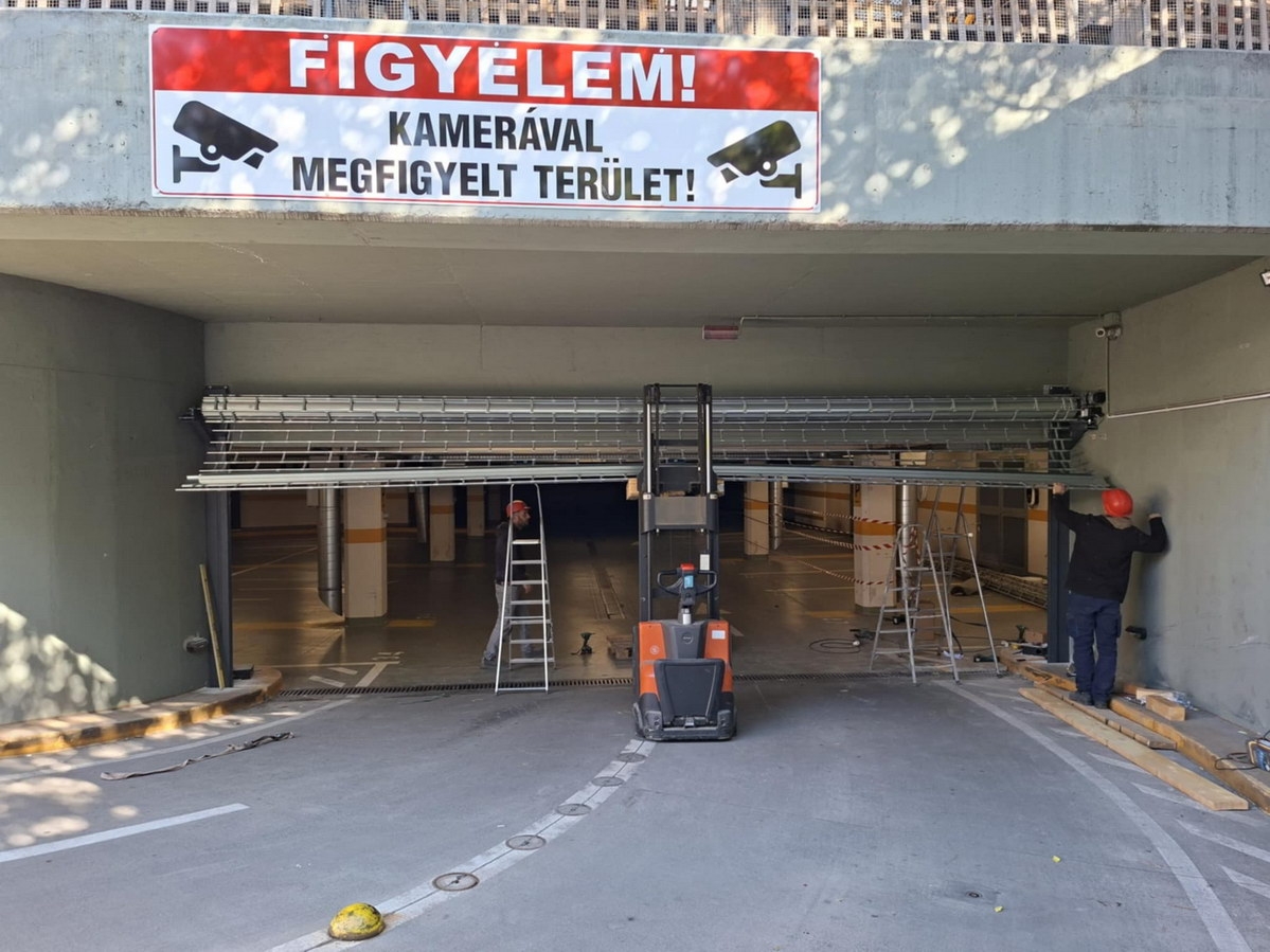 A garázs lehajtó sávjában elhelyezkedő, 8 méter széles felgördülő kapu teljes cseréje vált szükségessé, mivel a korábbi szerkezet sérülés miatt használhatatlanná vált. A munkálatok során a régi, kissé elavult rács rolót (tartókonzolokkal együtt) kicserélték, így a mélygarázs most egy új, modernebb, könnyebben kezelhető és biztonságos kaput kapott.